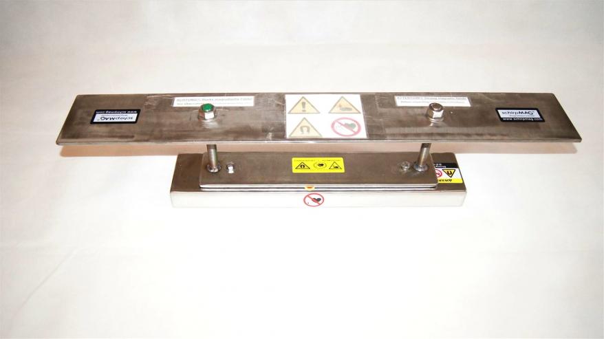 Die Trägerplatte mit umklappbarem Neodym Magneten wird zwischen die Seitenführung oberhalb der Förderbandlaufdecke montiert. Bild rechts